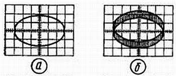 Плавно перемещая движок резистора R4 вверх, подают на вход смесителя такой сигнал с вспомогательного генератора, чтобы эллипс стал размытым (рис. 69, б).