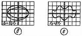 Во втором случае частоту генератора увеличивают до получения, например, изображения шести синусоид (рис. 69, е).