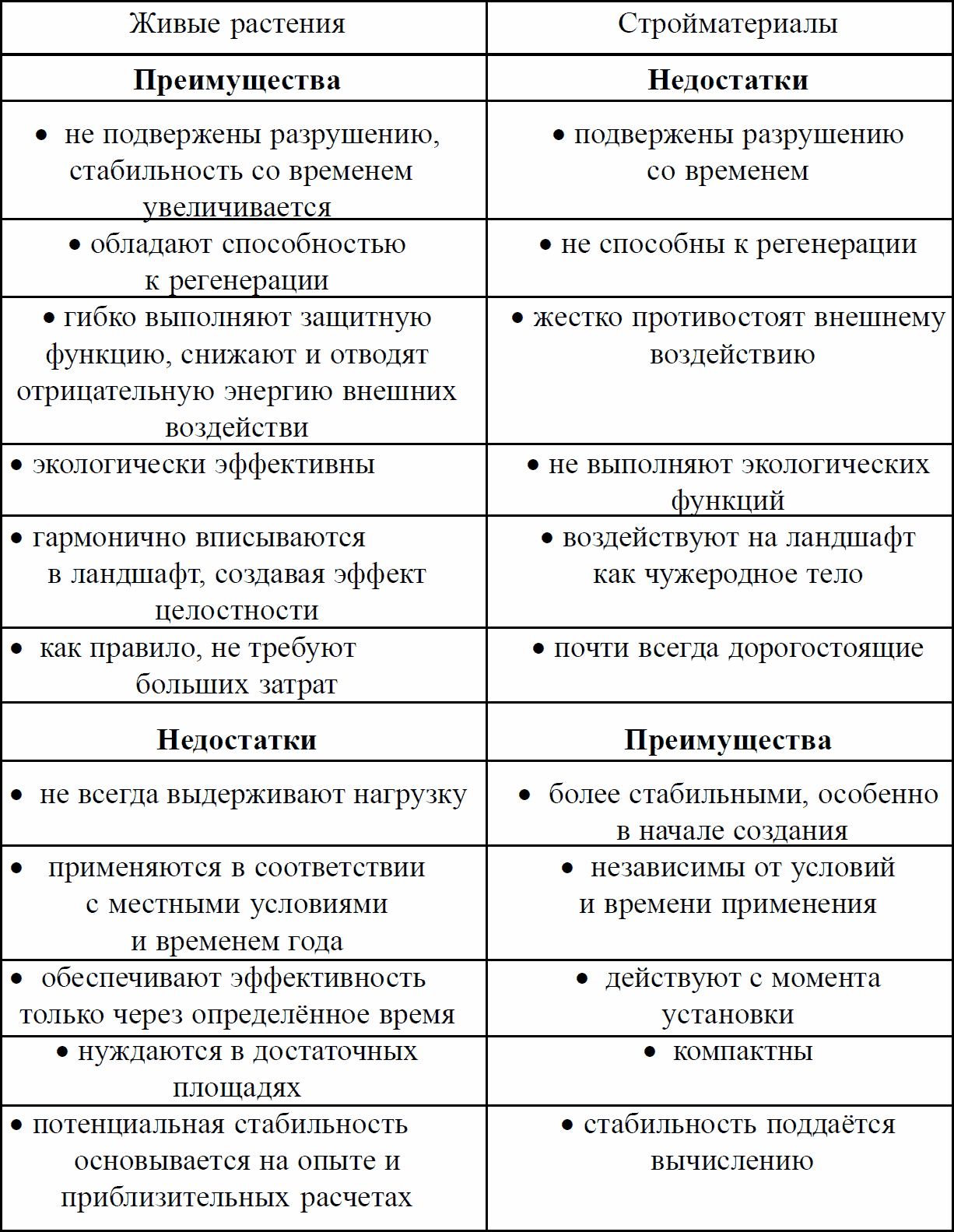 ТАБЛИЦА 15. Преимущества и недостатки живых растений и стройматериалов