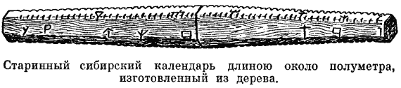 Около ста лет назад у нас, в Сибири и на Европейском Севере, еще были в ходу самодельные календари из дерева, обычно шестигранные бруски длиной около полуметра. На ребре каждой из шести граней нарезали зубцы по числу дней для двух очередных месяцев. Глубокая выемка поперек всего бруска делила каждую грань пополам — на отдельные месяцы. Условные метки указывали праздничные дни. С таким календарем не запутаешься.
