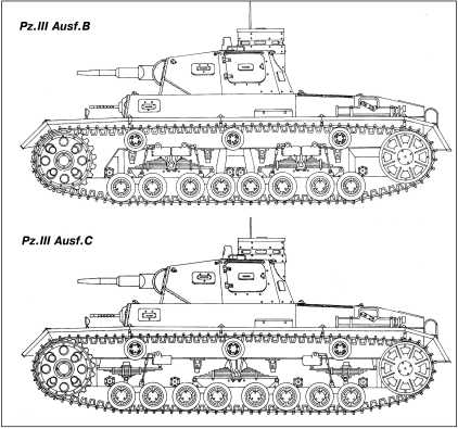 Вверху: Pz.III Ausf.J с короткоствольной 50-мм пушкой. Внизу: танк Pz.III Ausf.J, вооруженный 50-мм длинноствольной пушкой.