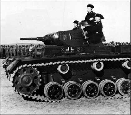 Pz.III Ausf.A во время учений в 1938 году. Хорошо видны ведущее колесо характерной только для этой модификации формы, два поддерживающих катка и пружинная подвеска.
