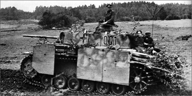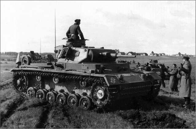 Pz.III Ausf.G ранних выпусков с 50-мм пушкой. 10-я танковая дивизия, Восточный фронт, 1941 год. Эта машина оборудована для подводного хода, возможно по этой причине на надгусеничной полке установлен нештатный ящик ЗИП, большего, чем обычно, размера.