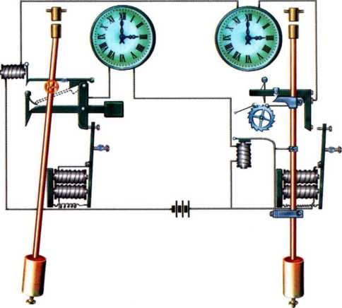«Командир» этот находился прямо-таки в идеальных условиях для работы: в глубоком подвале, защищенный от сотрясений, при постоянной температуре. Мало того, для уменьшения сопротивления при качании маятника воздух из футляра часов частично выкачивался. Связь между двумя маятниками была электрическая, с участием электромагнитов.