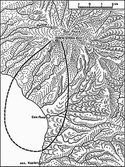 Рис. 15. Карта района кратера вулкана Пеле (по А. Лакруа).