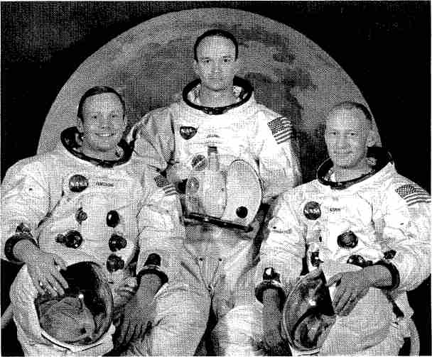 Экипаж корабля: командир — Нил Армстронг, 39 лет, «Джемини-8», первым ступит на Луну; пилот LM — Эдвин (Базз) Олдрин, 39 лет, «Джемини-12», выйдет на Луну вторым; пилот СМ — Майкл (Майк) Коллинз, 39 лет, «Джемини-10», останется на орбите вокруг Луны. Все трое — военные летчики — испытатели, выпускники престижных академий, бакалавры наук. Командный (СМ) и лунный (LM) модули в этом полете назвали «Колумбия» и «Орел». Эта экспедиция — самая «историческая», поэтому мы опишем ее более детально.