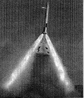 Рис. 6.26. Система аварийного спасения и её испытание. За несколько секунд ракета уводит командный модуль с экипажем на сотни метров от терпящего бедствие носителя.