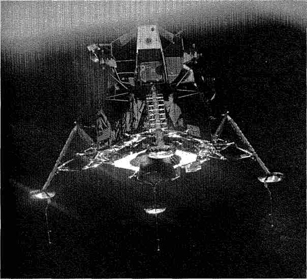 Рис. 6.30. «Орел» прощается с «Колумбией». Под тремя опорами посадочной ступени лунного модуля видны тонкие щупы длиной 1,5 м. Касаясь поверхности, они давали сигнал, что надо быть готовыми к выключению двигателя. Предполагалось, что поднятое реактивной струей облако пыли может окутать кабину и сделать поверхность невидимой.