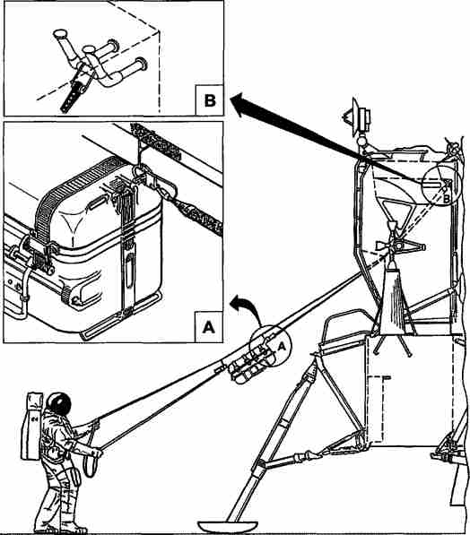 Рис. 6.36. Lunar Equipment Conveyor (LEC) — это капроновый ремень, натягиваемый астронавтами из кабины к поверхности. К нему карабинами подвешивается груз и перемещается в нужном направлении (альпинисты с помощью подобного устройства переправляют себя и грузы через ущелья).