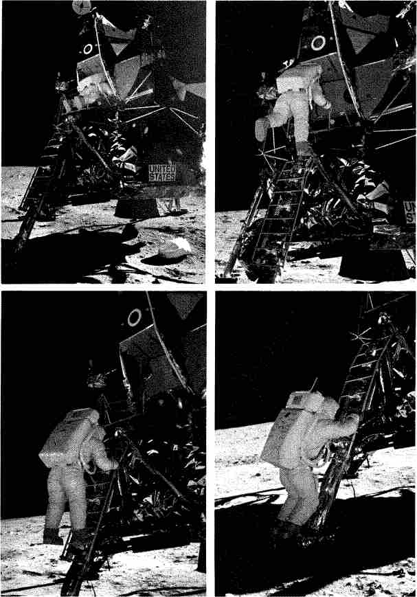 Рис. 6.38. Базз Олдрин выходит на прогулку по Луне. На верхнем левом фото под LM видна белая сумка, в которой Армстронгу спустили фотокамеру и пакеты для образцов грунта.