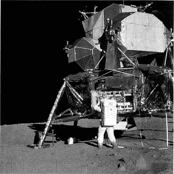 Наконец?то командир и пилот встретились на Луне. Тесных объятий или ударов рука об руку (как в кинофильме «Аполлон-11») не было, ведь у Нила на груди торчала солидная камера «Хассельблад». Вместо этого была чрезвычайно милая сценка — две сутулые белые «гориллы» несколько секунд приветственно подпрыгивали друг перед другом. Попрыгав, стали обмениваться впечатлениями. Олдрин заметил, что он еще ничего не сделал, а скафандр уже выпачкан пылью, которая, видимо, осела на трап во время посадки. Оба отметили, что ранцевая система за плечами почти не стесняет движений благодаря мягкой и эластичной ткани скафандров. Затем астронавты обратили взоры на грунт под посадочным двигателем и удивились, что реактивная струя не вырыла в порошкообразном материале заметной воронки, а лишь оставила на поверхности радиально разбегающиеся следы. Осмотрев посадочные стойки, отметили, что все три щупа согнуты в одном направлении, что говорило о наличии у LM боковой скорости при посадке. (На стойке с трапом щупа не было, так как при посадке он мог бы загнуться вверх и стать препятствием при спуске с трапа.)