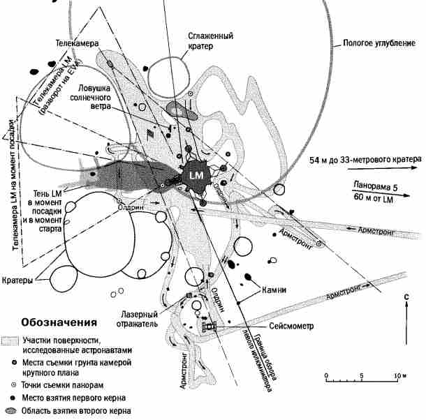 Просматривая сотни раз: в замедленном и ускоренном темпе, поступательным и обратным ходом — видеозапись последних секунд посадки, сверяя ее с фотопланом места прилунения, удивляешься хладнокровию и мастерству командира Армстронга. Нил поставил LM точно в центр сравнительно чистого участка, на почти одинаковом удалении от всех окружающих площадку неровностей — кратеров, вмятин, камней, с вертикальным креном всего 4,5°.