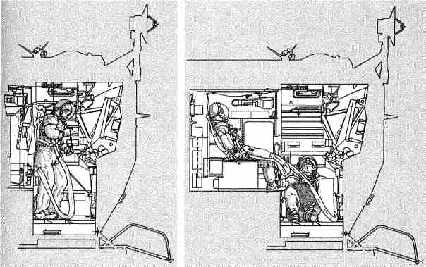 Рис. 6.49. Расположение астронавтов во взлетной ступени лунного модуля. Слева: в таком положении пилот управляет полетом. Справа: а так Армстронг и Олдрин пытались провести свой последний эксперимент — заснуть в LM.