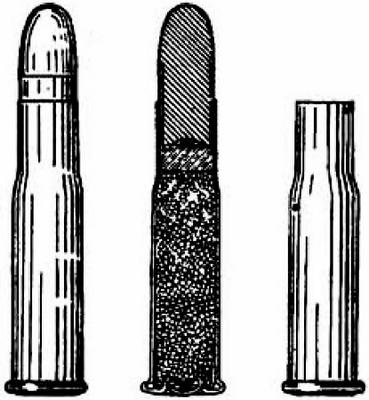 В дальнейшем, когда сконструировали кроме пехотной драгунскую и казачью винтовки и карабин, ко всем им был принят тот же патрон, отличавшийся лишь весом заряда (пехотная — 5,07 г, остальные — 4,26 г), числом просальников (пехотная — 1, остальные — 2) и цветом оберточной бумаги (пехотная белая, остальные — розовые)[290].