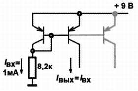 Эта схема работает следующим образом. Левый по схеме транзистор представляет собой фактически диод, т. к. у него коллектор соединен с базой. Из характеристики диода (см. рис. 6.1 в главе 6) видно, что при изменении прямого тока на нем несколько меняется и падение напряжения (оно не равно точно 0,6 В). Это напряжение без изменений передается на базу второго, ведомого транзистора, в результате чего он выдает точно такой же ток — но только при условии, что характеристики транзисторов согласованы с высокой степенью точности. То есть если току 1 мА через первый транзистор соответствует напряжение на его переходе база-эмиттер, равное, к примеру, 0,623 В, то такому же напряжению на переходе второго транзистора должен соответствовать такой же ток. Мало того, это соответствие должно сохраняться во всем диапазоне рабочих температур! Естественно, столь высокая идентичность характеристик практически недостижима для дискретных приборов, а для транзисторов, входящих в состав микросхемы, она получается сама по себе, без дополнительных усилий со стороны разработчиков.