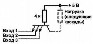 В микросхемах могут использоваться такие разновидности транзисторных структур, которые в обычной дискретной жизни не имеют аналогов, — скажем, многоэмиттерные или многоколлекторные транзисторы. Для примера на рис. 11.3 приведена схема входного каскада микросхемы транзисторно-транзисторной логики (ТТЛ), осуществляющей логическую функцию «ИЛИ» (подробно об этом рассказано в главах 14 и 15). В этой схеме замыкание любого из трех эмиттеров (или двух, или всех вместе — потому функция и называется «ИЛИ») на общий провод питания приведет к тому, что транзистор откроется и обеспечит ток через нагрузку.