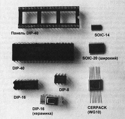 Рис. 11.5. Некоторые распространенные корпуса микросхем. Вверху слева — панелька для корпусов типа DIP