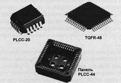 Некоторые характерные типы корпусов микросхем приведены на рис. 11.5 и 11.6. Вверху слева на рис. 11.5 показан пример панельки («сокета») для корпусов типа DIP, которая позволяет не впаивать микросхему в плату. Внизу на рис. 11.6 показана аналогичная панелька для корпусов типа PLCC (пример самого корпуса выше на рисунке).