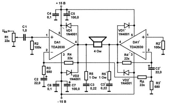 Остальные элементы схемы — вспомогательные. Конденсаторы С4-С7 — развязывающие по питанию (в нашей схеме тоже рекомендовалось их устанавливать), причем заметьте, что в целях лучшей защиты от помех и повышения устойчивости схемы здесь рекомендуется установить неполярные (например, керамические) конденсаторы (С4 и С6) параллельно с электролитическими (С5 и С7). Цепочка R5-C3, которой у нас не было, здесь обеспечивает повышение линейности усилителя при работе на индуктивную нагрузку. Диоды VD1-VD2 служат для предотвращения возможного выхода из строя выходных каскадов микросхемы при индуктивных выбросах напряжения, например, при включении питания (ох, до чего же нежные эти западные транзисторы!). Все электролитические конденсаторы должны быть рассчитаны на напряжение не менее 16 В.