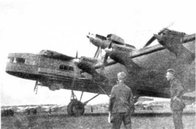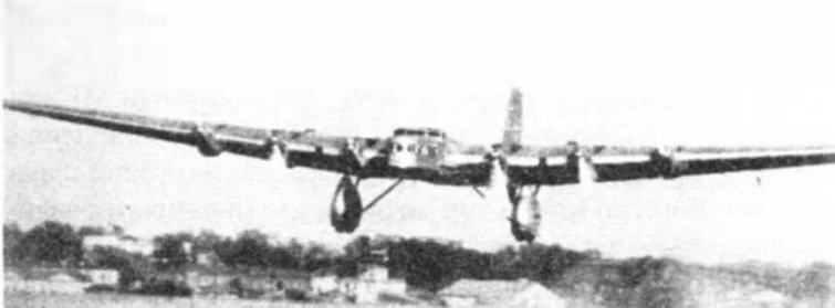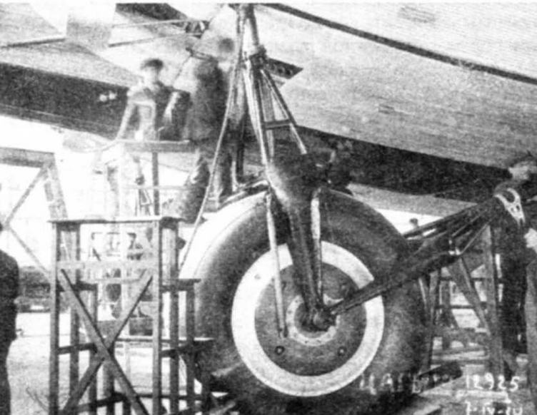 Неубирающееся шасси сильно напоминало ТБ-4. На каждой основной стойке монтировалось по два колеса двухметрового диаметра и почти полуметровой ширины. Им при посадке предстояло выдержать нагрузку в 30 т. В колесах были упрятаны барабаны с колодочными тормозами. Они включались сжатым воздухом. Позднее пары колес намеревались для улучшения аэродинамики закрыть большими каплевидными обтекателями (что и сделали).