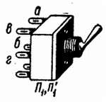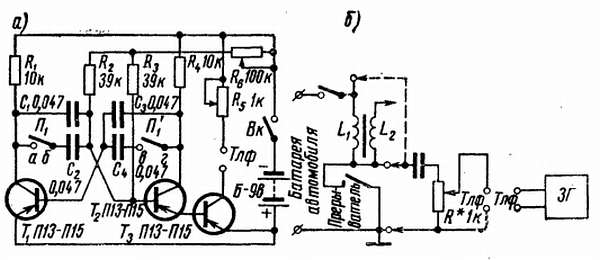 Тахометром для измерения числа оборотов в этих пределах может служить двухдиапазонный генератор, собранный по схеме мультивибратора, показанной на рис. 8, а. Он собран на двух транзисторах Т1 и Т2 с усилителем мощности на транзисторе Т3. Переключатель П1 предназначен для перехода с диапазона 50—200 гц на диапазон 100–400 гц. Он собирается на тумблере 2x2, где выводы — точки б и г — являются средними контактами, а точки а и в — боковыми.