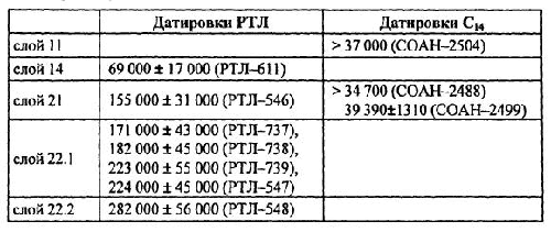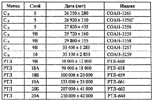 Таблица 2. Датировки отложений разреза Усть-Каракол по данным физических методов [Деревянко и др. 1998]