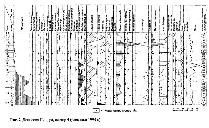 Общее количество определенных костных остатков в коллекции 1994 г. составляет 6353 экземпляра. В среднем каждый слой охарактеризован приблизительно 200 определенными остатками. В целом верхние слои охарактеризованы менее надежно, чем нижние. Общий список таксонов, установленных для плейстоценовых слоев Денисовой пещеры, включает более 40 названий. Их количественное соотношение по каждому слою приведено на диаграммах (рис. 2), анализ которых позволяет сделать ряд заключений.