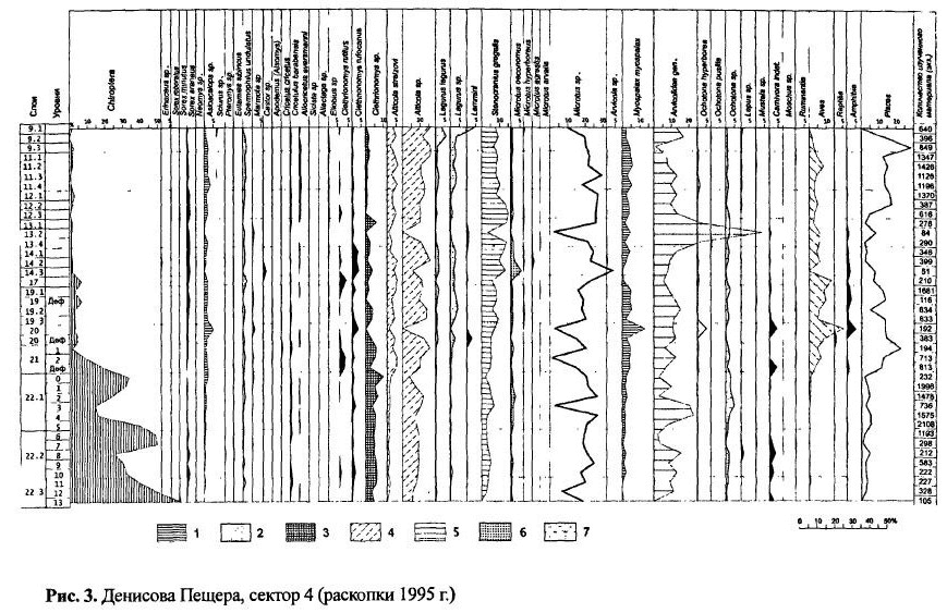 Нижняя часть плейстоценовой толщи Денисовой пещеры — уровень 13 слоя 22.3 — отличается довольно высокой численностью рыжих полевок (5,6 %), цокора (14,5 %), плоскочерепной полевки (15 %). К уровню 12 слоя 22.3 относительное количество названных видов падает почти в два раза. Такая же тенденция наблюдается и по сборам 1994 г.