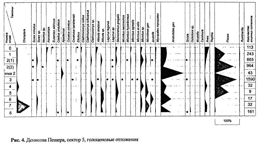 Мелкие млекопитающих голоценовых отложений Денисовой пещеры были изучены по материалам юго-восточной галереи (сектор 5) квадраты: А 2–6, Б 2–6, В 2–6, Г 2–6. Всего в определении было использовано 3869 костей. Установлено 36 таксонов: птицы, рептилии, рыбы, остальные 33 — млекопитающие (рис. 4). Значительную часть скелетных остатков в средних и верхних слоях составляют кости и чешуя рыб. Они преобладают в слоях 1,2.1,3 и 5, с наибольшем количество (88,5 %) их костей в 3 слое. В нижних слоях они редки или отсутствуют.