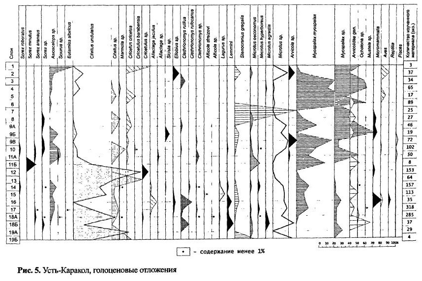 Данные по составу ориктоценоза каждого слоя с минимальными искажениями соответствуют составу исчезнувшего биоценоза времени накопления осадков. Это имеет и свои издержки. Поскольку при формировании танатоценозов Усть-Каракола не происходила концентрация материала с прилежащей территории, полученные результаты относятся только к данной конкретной площади и не могут быть аппроксимированы на весь бассейн Ануя. С другой стороны, количественные соотношения различных видов в составе тафоценозов каждого слоя отражают их реальное соотношение в составе исчезнувших биоценозов данной территории. Эго придает особую ценность материалам открытой стоянки Усть-Каракол.