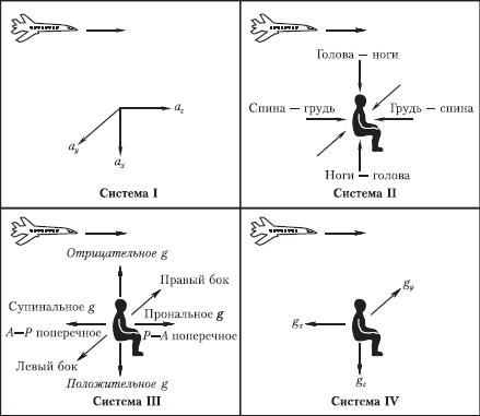 В зависимости от направления действия перегрузок по отношению к вертикальной оси тела их делят на продольные и поперечные. При направлении вектора перегрузки от головы к ногам говорят о положительных, а при направлении от ног к голове – об отрицательных перегрузках. Кроме того, различают поперечные (спина – грудь и грудь – спина), а также боковые (бок – бок) перегрузки. Направление вектора перегрузки имеет существенное значение для организма, и при описании физиологических реакций его всегда нужно учитывать.