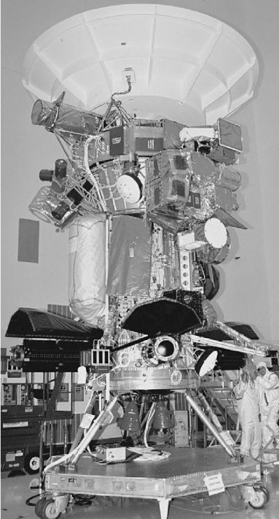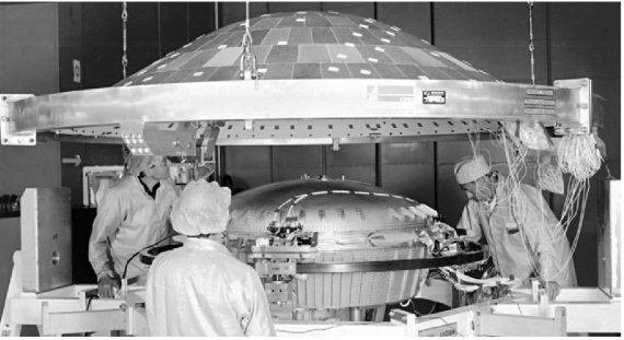 Рис. 8.12. Сборка зонда «Гюйгенс» на предприятии Daimler-Benz Aerospace. Над зондом – тепловой экран, защищающий его при входе в атмосферу Титана.
