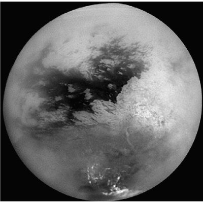 Наземные наблюдения еще до начала космической эры показали, что Титан имеет плотную атмосферу; по сути, это единственная планета-спутник с полноценной атмосферой. Пролетая в 1981 г. через систему Сатурна, «Вояджер-2» обнаружил, что основной компонент атмосферы Титана – азот (N2); в ней присутствуют также метан (СН4) и другие углеводороды. Данные космического телескопа «Хаббл» и наземных телескопов позволили в 1995 г. заподозрить существование на поверхности Титана значительных площадей, покрытых жидким метаном. Но подтвердилось существование этих углеводородных озер лишь после того, как к интенсивным исследованиям приступил первый искусственный спутник Сатурна – «Кассини», с борта которого 14 января 2005 г. на поверхность Титана опустился зонд «Гюйгенс». Экспедиция «Кассини – Гюйгенс», организованная NASA, ESA (Европейским космическим агентством) и ASI (Итальянским космическим агентством), началась 15 октября 1997 г., но лишь в середине 2004 г. аппарат прибыл в систему Сатурна и приступил к работе (см. с. 16 цветной вкладки).
