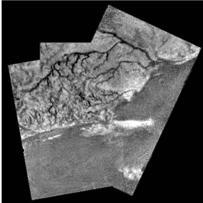 Рис. 8.14. Мозаика из фотографий поверхности Титана, полученных «Гюйгенсом» при спуске на парашюте. Вверху – светлая гористая местность, пронизанная руслом реки с притоками. В нижней части – более темная плоская низменность, куда впадает «река». В момент съемки русло было сухим. Вероятно, в периоды редких, но мощных дождей его заполняют потоки метана.