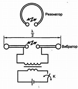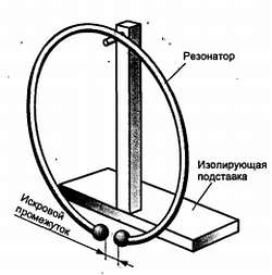 Настроив резонатор на вибратор с помощью подбора диаметра кольца, можно разглядеть появление между шариками резонатора небольшой искорки в момент срабатывания вибратора. Искорка появляется на расстоянии между шариками не более З мм, да и разглядеть ее возможно только в увеличительное стекло. Опыт Герца представлен на рис. 10.3.