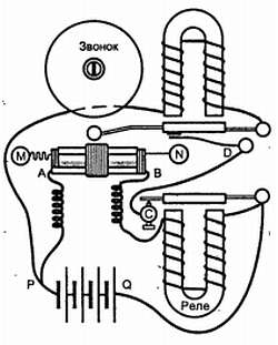 Действует прибор следующим образом. Ток батареи напряжением 4–5 В постоянно циркулирует от зажима Р к платиновой пластинке А, далее через порошок, содержащийся в трубке, к другой пластинке В и по обмотке электромагнитного реле обратно к батарее. Сила этого тока недостаточна для притягивания якоря к реле, но если трубка АВ подвергнется действию электрического колебания, то сопротивление мгновенно уменьшится и ток увеличится настолько, что якорь реле притянется. В этот момент цепь, идущая от батареи к звонку, прерванная в точке С, замкнется и звонок начнет действовать, но тотчас же сотрясение трубки опять уменьшит ее проводимость и реле разомкнет цепь звонка.