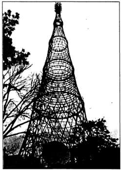 Как ни странно, но произведения искусства — картины, скульптуры, украшения — сохраняются в веках лучше,» чем предметы технической мысли. Многое из того, что было разработано на заре радиотехники, сохранилось лишь в фотографиях, рисунках, формулах, графиках. Многое, к сожалению, утрачено. Но многое хранится до сих пор, составляя фонд достижений нашей истории. Один из таких экспонатов до сих пор стоит в Москве под открытым небом, поскольку ни в один павильон ему не поместиться. Это — знаменитая Шуховская башня, спроектированная инженером Владимиром Григорьевичем Шуховым (1853–1939) для размещения антенны станции РВ-1 (рис. 10.6).