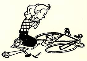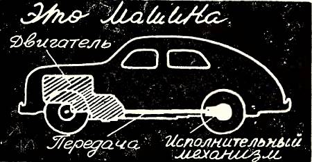 Теперь нам ясно, почему, например, переносный точильный станочек не машина. В нем есть двигатель (нога точильщика), передаточный механизм (педаль с колесом), но нет исполнительного механизма, — человеку приходится самому прижимать ножи к точилу. А автомобиль, который я нарисовал на доске, — машина, в нем есть и двигатель (мотор), и передача (коробка скоростей, карданный вал), и — самое главное — исполнительный механизм (колеса). Водитель же только управляет работой этой машины. Теперь вы и сами решите, машина ли велосипед?