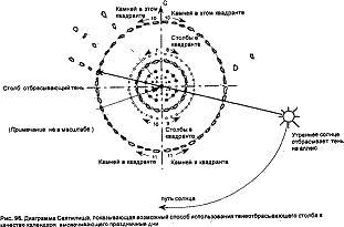 Со сменой времен года будет меняться длина полу денной тени. Длиннее всего она оказывается в день зимнего солнцестояния, а короче всего — в день летнего солнцестояния. Концентрические кольца святилища могут служить календарем. Даты определяются в зависимости от конкретного кольца, до которого дотянется тень полуденного солнца. С помощью проведенных Обри Бэрлом измерений местоположения колец я сделал ряд расчетов на основе положений солнца на этой широте в разные времена года. Но прежде мне нужно было установить высоту вехи. Не располагая конкретными данными, я мог лишь строить догадки, но догадки, основанные на определенном знании.