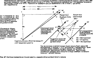После измерения длины теней следовало точно вычислить широту. Полуденная тень простого столба указала бы топографам приблизительную широту. Она определила бы, что оба объекта вписываются между 51° и 53° северной широты. Затем они могли бы заняться вычислением обеих широт способом, показанным на рисунке 97.