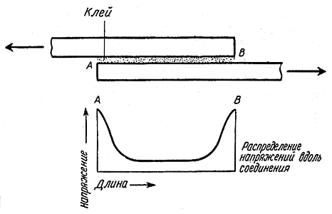 Рис 41. Клеевое соединение внахлестку; внизу показано распределение напряжений вдоль соединения. Максимальное напряжение - в точках А и B.