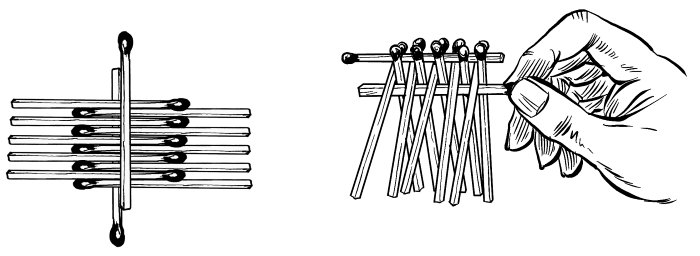 Сложите из дюжины спичек сооружение, изображенное здесь на рисунке, и затем постарайтесь поднять всю эту кучу спичек за выступающий конец нижней спички. Если вы достаточно ловки, это удастся. Видите, как при известной сноровке и изобретательности одной спичкой можно поднять одиннадцать.