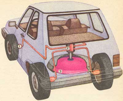Легковой махомобиль Рабенхорста: 1 - гидродвигатель колес; 2 - электродвигатель-генератор; 3 - супермаховик.