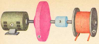 Маховичная катапульта: 1 - двигатель; 2 - маховик; 3 - муфта включения; 4 - лебедка.