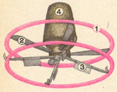 Маховичный беспилотный вертолет: 1 - кольцевые супермаховики; 2 - тяговая лопасть; 3 - лопасть управления; 4 - приборы и груз.
