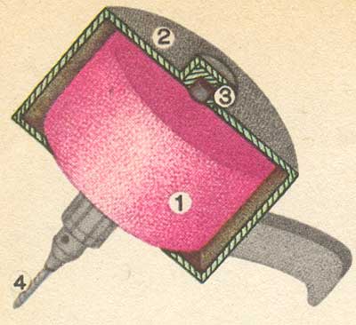 Маховичная «безреактивная» дрель: 1 - маховик; 2 - корпус; 3 - подшипник; 4 - сверло.