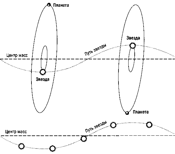 Рис. 6.5. Взаимное движение звезды и планеты. Центр масс системы «звезда + планета» движется прямолинейно (пунктир). Звезда и планета обращаются вокруг центра масс по подобным орбитам в противофазе (вверху). Наблюдая звезду, можно заметить ее «покачивания», указывающие на присутствие планеты.