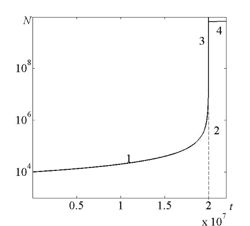 График развития в режиме с обострением изображен на рис. 1. Здесь функция N (t) – это некоторый интегральный показатель системы, например, общая численность людей, если рассматривать эволюцию мирового сообщества, или – число разных типов клеток, если брать биологическую эволюцию, и т. д.