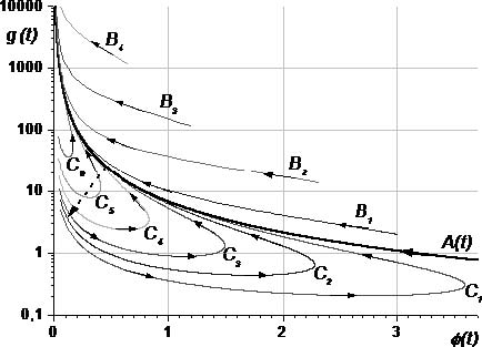 Рис. 2. Фазовая плоскость системы. A(t) – автомодельная траектория;В., С.-траектории системы;С – циклы