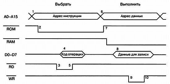 Система синхронизации и управления декодирует инструкцию и определяет, требует ли она операндов. Если да, то они выбираются из следующих ячеек памяти таким же образом, что и код операции. Когда все части инструкции переданы в ЦПУ, начинается выполнение инструкции: считывание величины из памяти или устройства ввода-вывода, инкрементирование величины во внутреннем регистре или запись величины из ЦПУ в память или выходной порт. Важно понимать, что в разные периоды во время выполнения цикла инструкции шина данных может содержать коды инструкций, информацию об адресе, величины данных, и иногда ничего не значащий «цифровой мусор». Для анализа имеющихся сигналов необходимо очень хорошо понимать синхронизацию микропроцессора. Для описания этого достаточно сложного процесса в 8 и 16-битовых шинах используются специальные временные диаграммы (рис. 9.6).